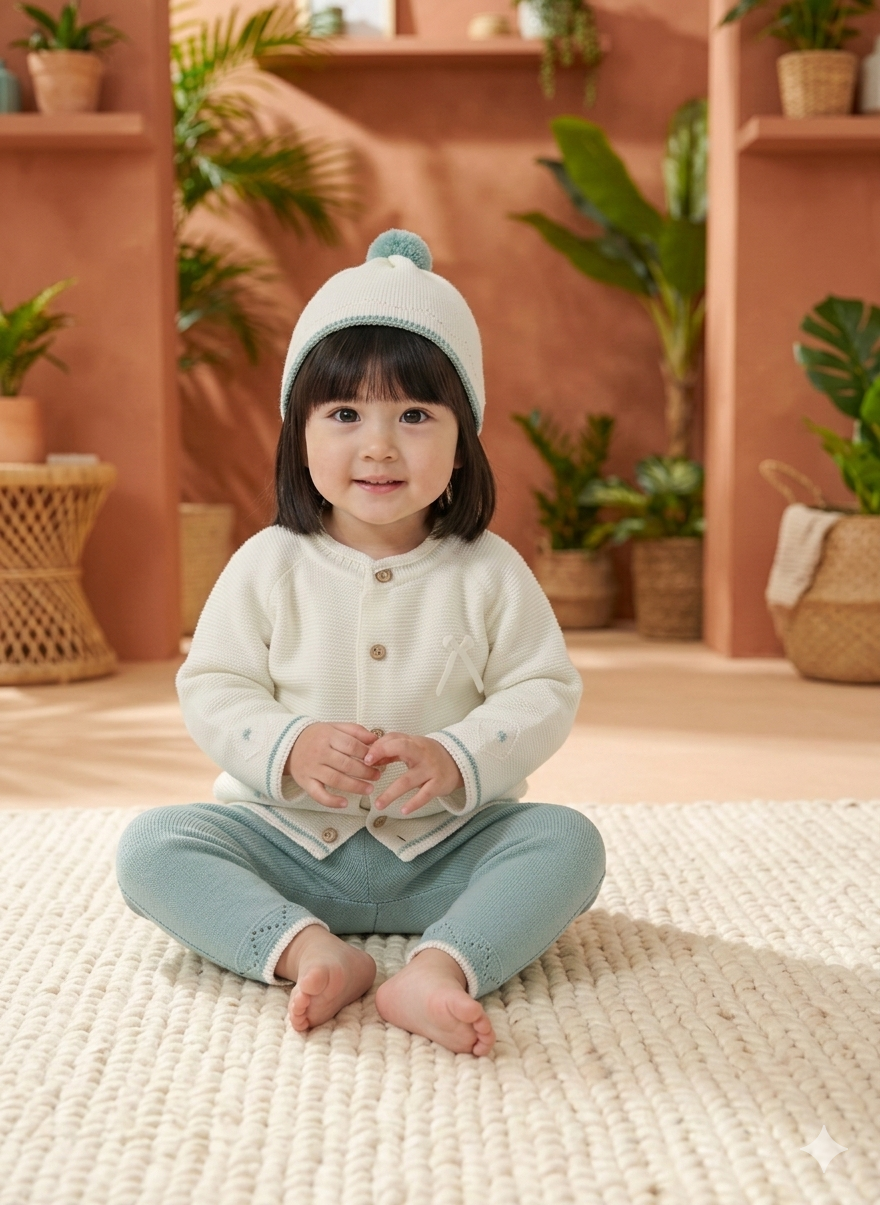 - Pantalón tejido: Confeccionado con punto acanalado para mayor elasticidad, permitiendo que tu bebé se mueva con total libertad manteniéndose calientito.