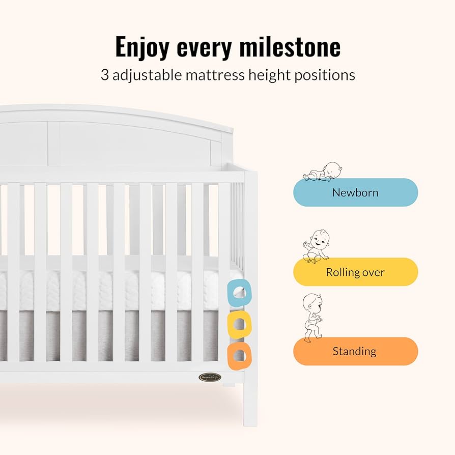 Cuna convertible Dream On Me Storybrooke 5 en 1 de tamaño completo en blanco, GreenGuard Gold y JPMA. Se convierte en cama infantil, sofá cama y cama doble. Fabricada en madera de pino sostenible, con 3 ajustes de altura.