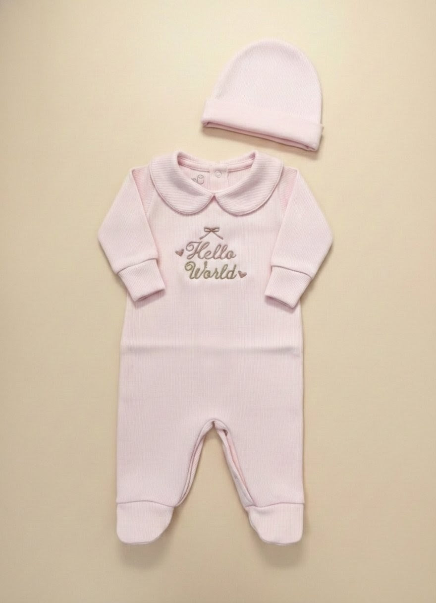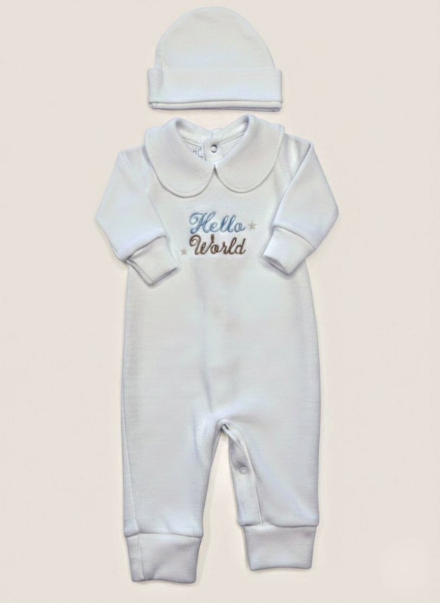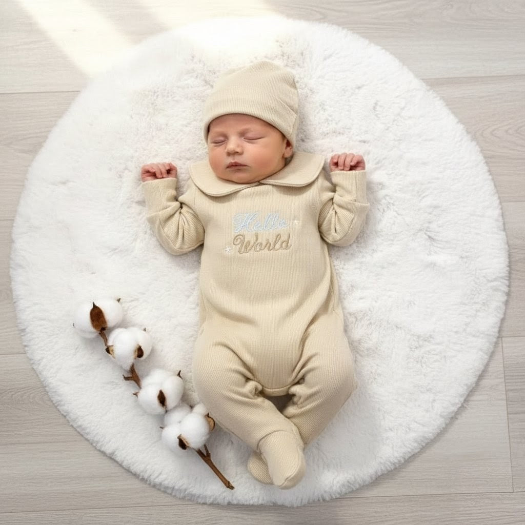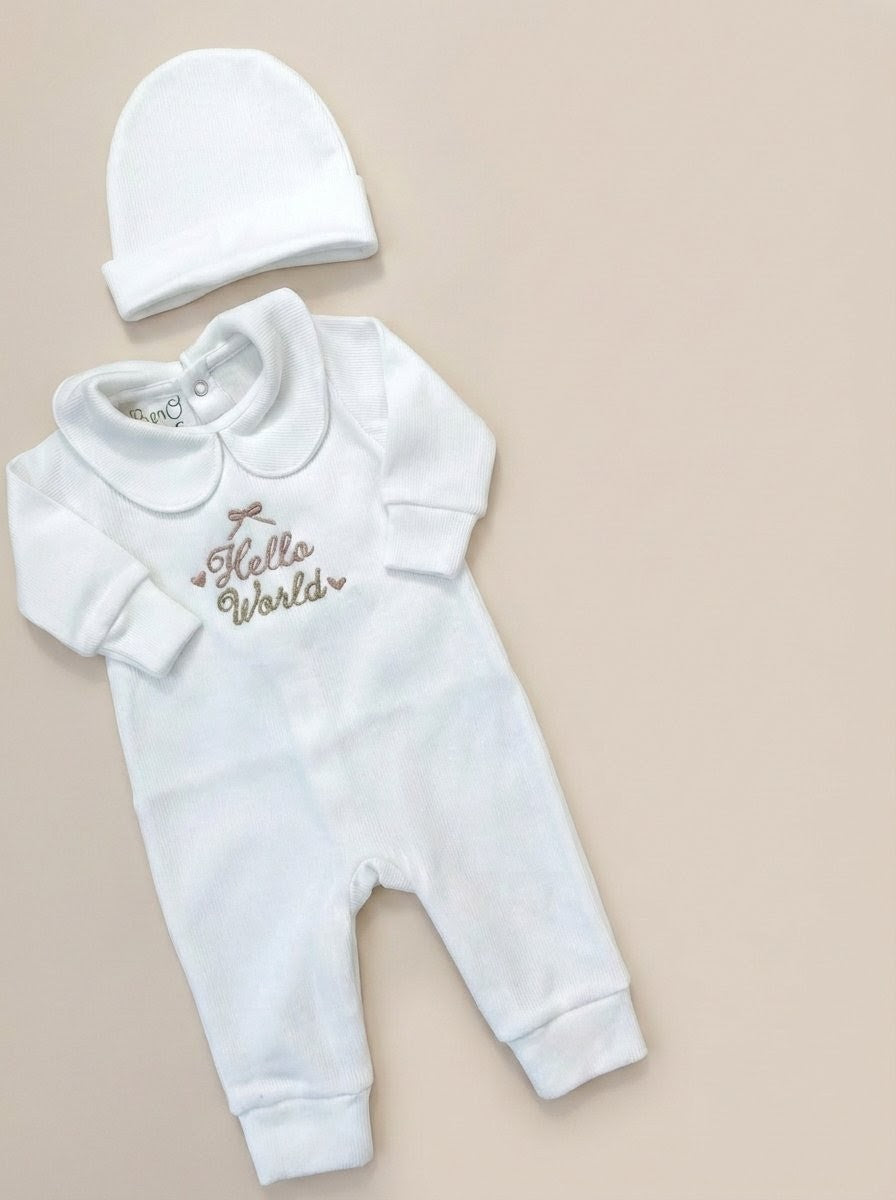 - Enterizo de manga larga: Con un delicado cuello estilo bebé (cuello Peter Pan) y un hermoso bordado central de "Hello World" (Hola Mundo). Cuenta con broches frontales/inferiores para facilitar el cambio de pañal sin incomodar al bebé.