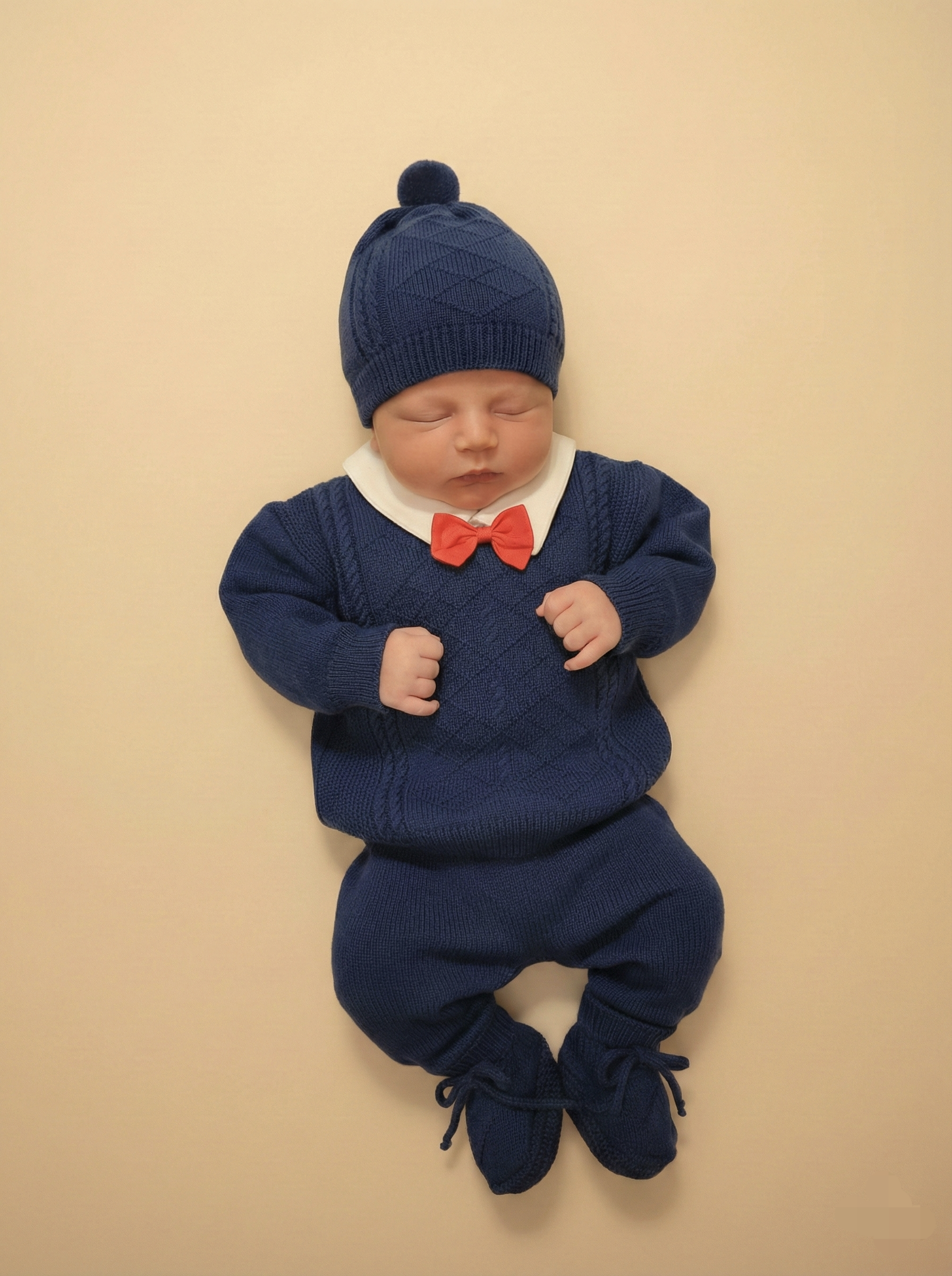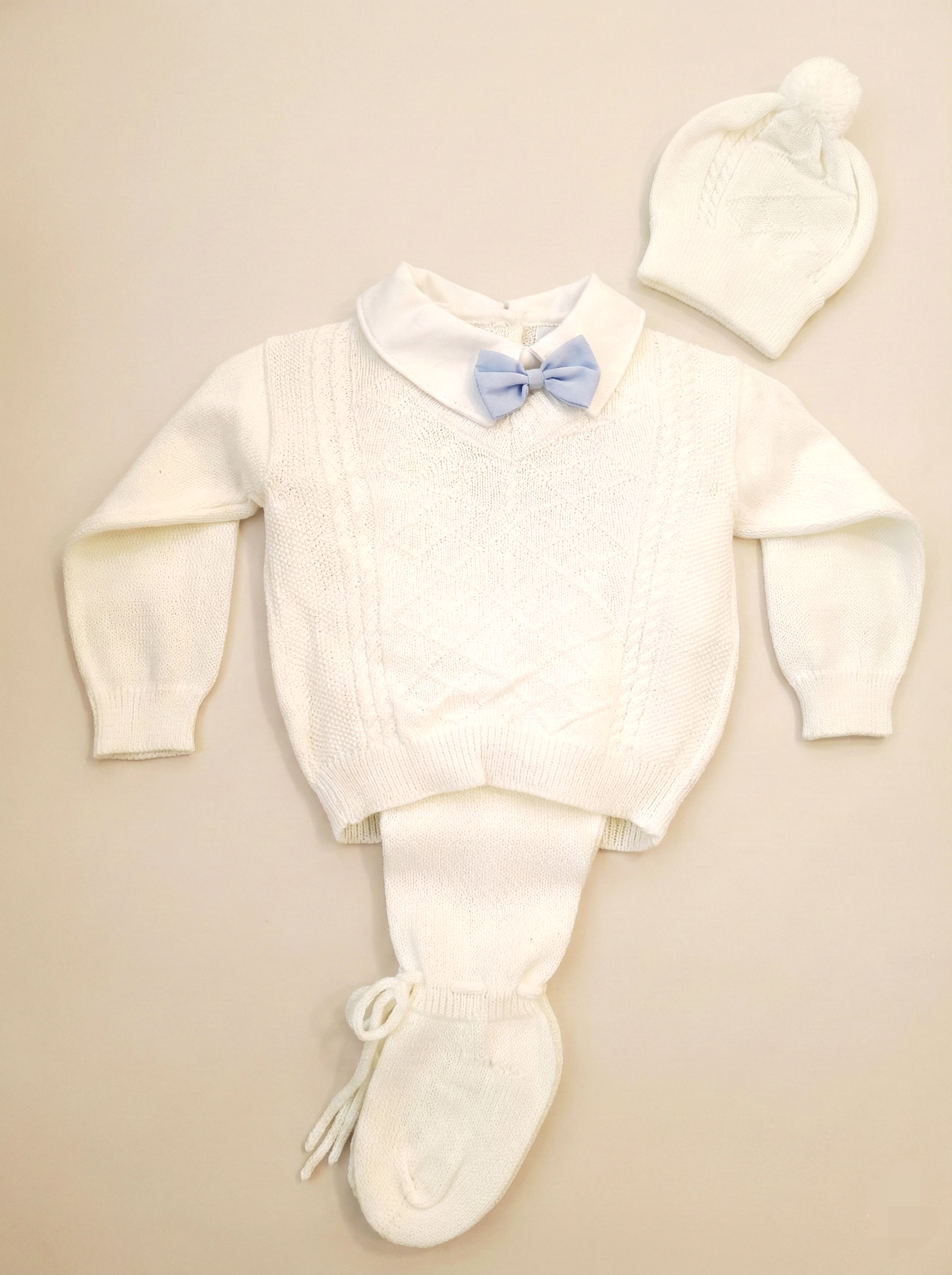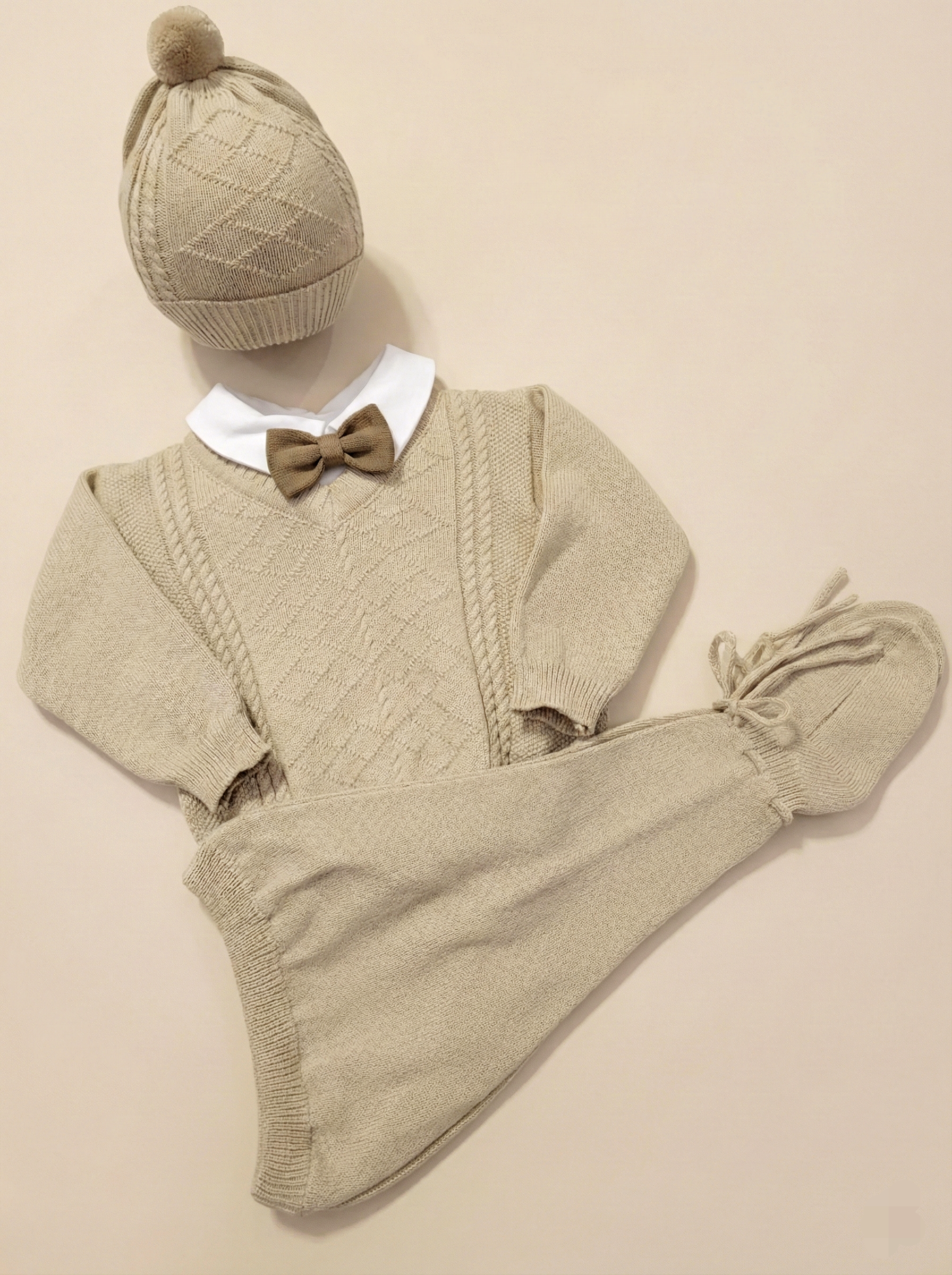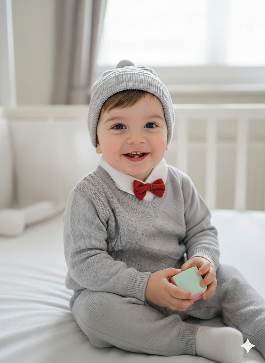 Prepara la llegada de tu príncipe con nuestro exclusivo Conjunto Tejido Corbatín. Diseñado especialmente como salida de clínica y para sus primeras fotos, este set combina la tradición del tejido de hilo con un toque moderno y elegante.